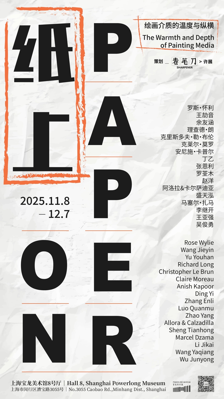 “纸上”展将纸本视为一个战场——在这里,线条不再是轮廓,而是时间的断层;留白不再是虚空,而是物质的喘息,是沉默的载体。纸并非一个被动等待被艺术家书写、绘画或塑造的空白容器,而是让观众看到它拥有的强烈“物性”,如纤维的肌理、吸墨的特性、厚度、色泽、气味、空白等,也看到笔触的流动与媒介的深度。