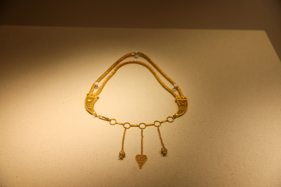 船上数量丰富的文物,不少有着东西方文化交融的痕迹。以1987年打捞出水的首件金器为例,这条宋金项饰全长1.72米,重566克,由四股八条纯金线编织成麻花状人字形纹路,带钩端饰有浮点纹和璎珞纹,融合阿拉伯、宋地与辽地艺术风格。郭亨文表示,这说明,海上丝绸之路是中国联通世界的通道,不仅有贸易,也是经济文化交流、和平友谊传递的通道。