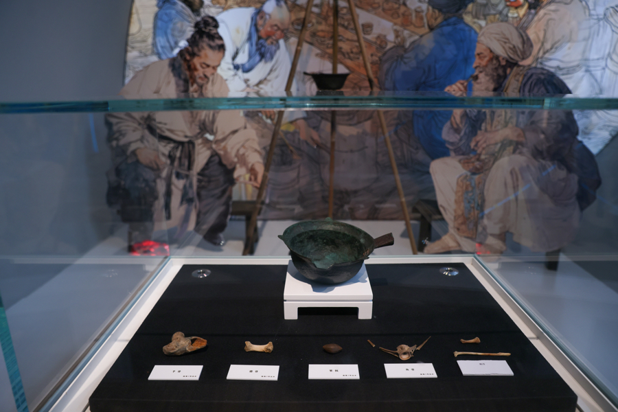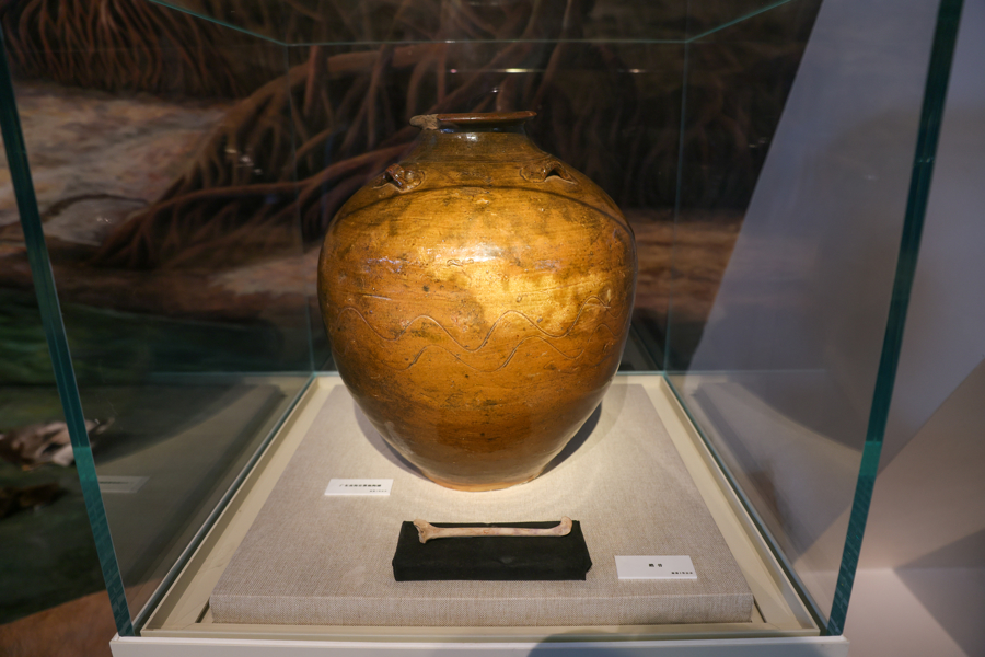 展厅一角,根据考古发掘的兽骨、果核、鱼骨等物品,复原了当时船员在船上用小锅烹煮食物等场景