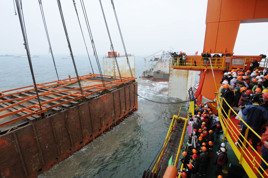 经过多年的准备,“南海I号”的整体打捞在2007年启动。在精准定位船体范围后,一个巨大的空心沉箱下沉至淤泥中,完全罩住沉船。36根钢梁依次穿过沉箱,使其变成一个巨型网兜,最后整体起吊。“沉箱40米长,14米宽,要把沉船正好套进去,实际操作不能有分毫差错。”国家文物局考古研究中心副主任、时任“南海I号”考古队领队的孙键坦言,他当时很担心沉箱把船切碎了。这就像从海底取上来一篮子鸡蛋,又不能让鸡蛋破损,其难度可想而知。后来“南海I号”全面保护发掘时,揭开左舷,船体距沉箱边仅20厘米,这一惊险细节至今令他后怕。